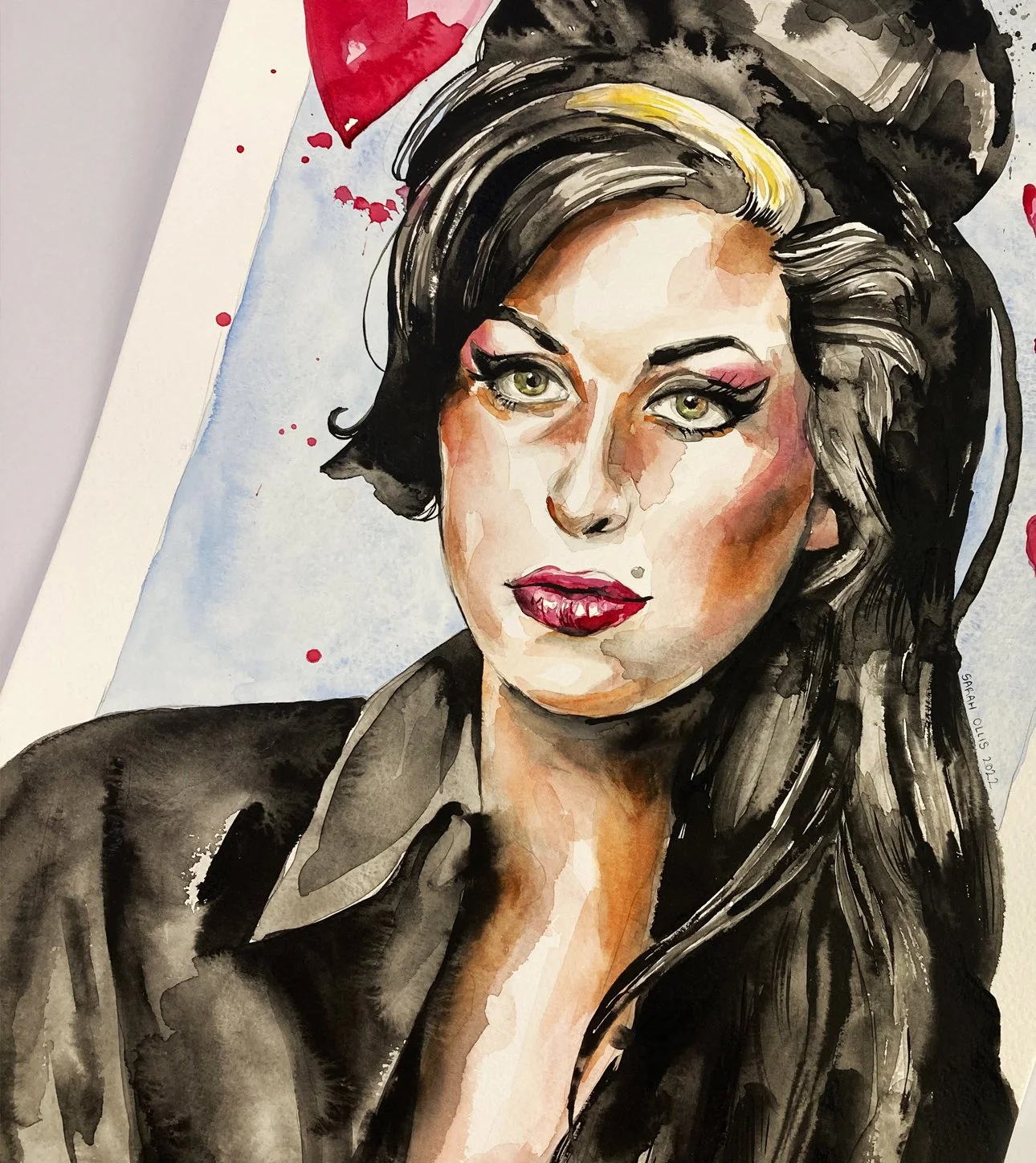 Watercolor painting of Amy Winehouse with long dark hair, wearing black eyeliner and red lipstick, set against a light blue background with red splashes.