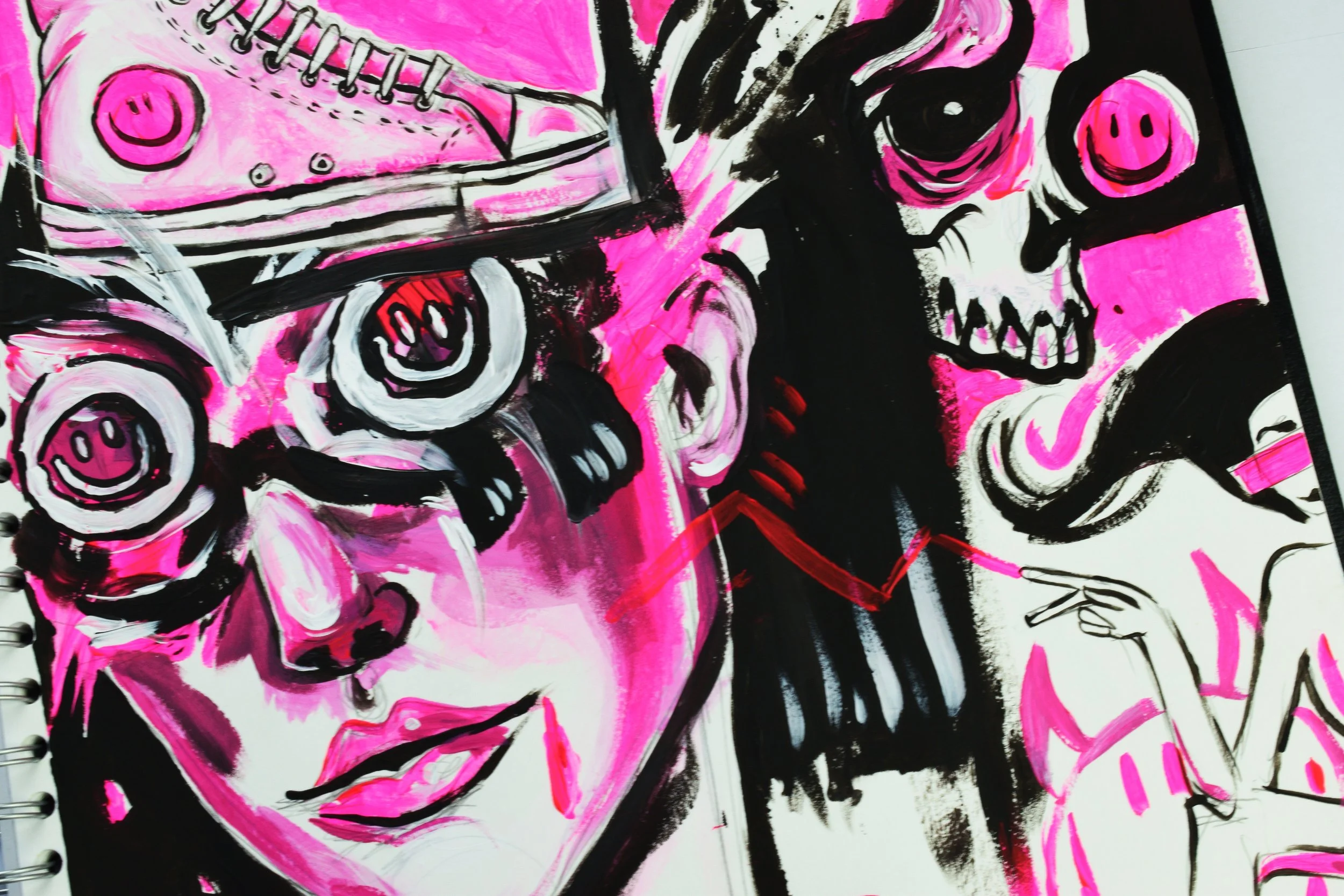 Abstract artwork with pink, black, and white elements, including a woman's face, a sneaker, a skull, and geometric shapes on a spiral-bound notebook.